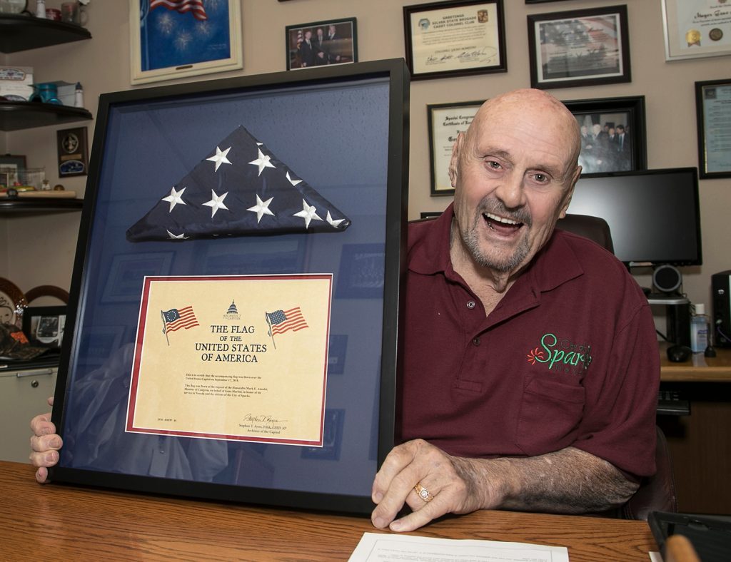 Sparks mayor Geno Martini displays a framed American Flag in his office that was presented to him recently by congressman Mark Amodei. Martini is calling it a career next month after serving as the city’s mayor since 2005.