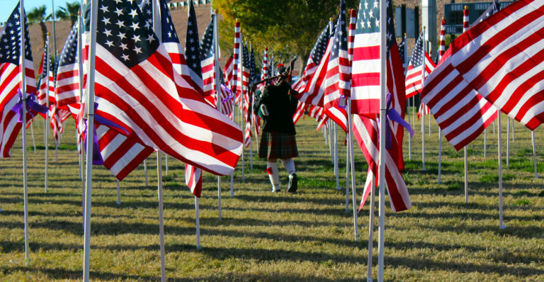 As is tradition with all previous 1000 Flags over Mesquite’s closing ceremony, Bagpipe player, Dennis Hangey, played Amazing Grace while taking his final walk through the field of honor.