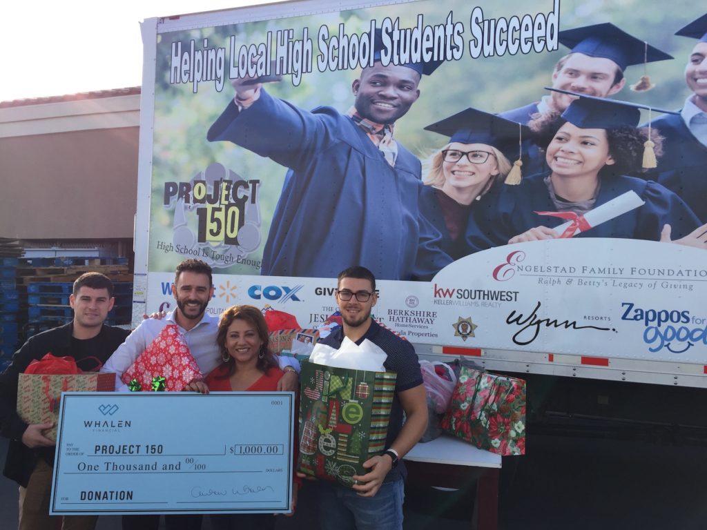 On Monday, Dec. 17, 2018, Whalen Financial presented a check for $1,000 to Project 150 and donated hundreds of coats in support of the holiday season. The coat drive was supported by Whalen Financial clients who made the donations at the firm’s Winter Celebration. Whalen Financial supports Project 150, which serves homeless, displaced and disadvantaged high school students throughout Nevada.
