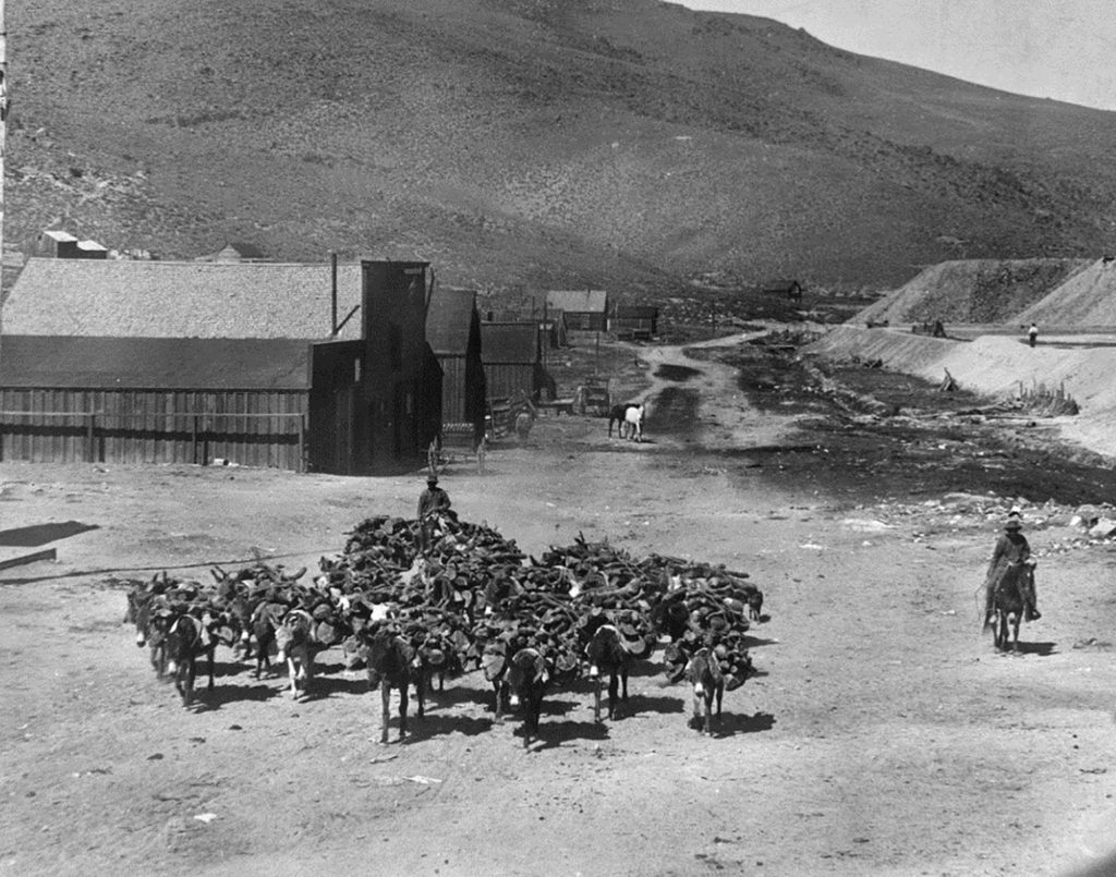 This 1908 photograph by J. Holman Buck shows wood being hauled by a team of burros in Bodie, California in 1908. Photo courtesy of Nevada Historical Society