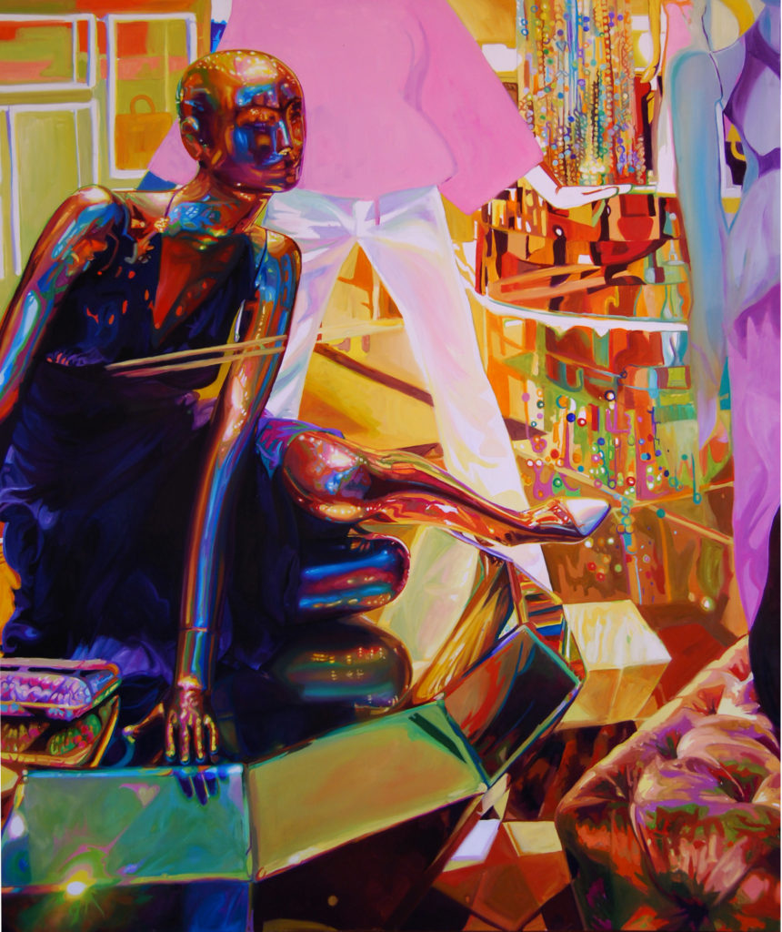 “She smelled amazing, not like dust, and her clothes were always so fashionable,” Develay said. “I came to be fascinated with the way clothes define us, the politics behind them, how we choose to dress to influence the world’s perception of us. The clothes in these paintings represent an ultimate desire. For me, they are status symbols of success.”